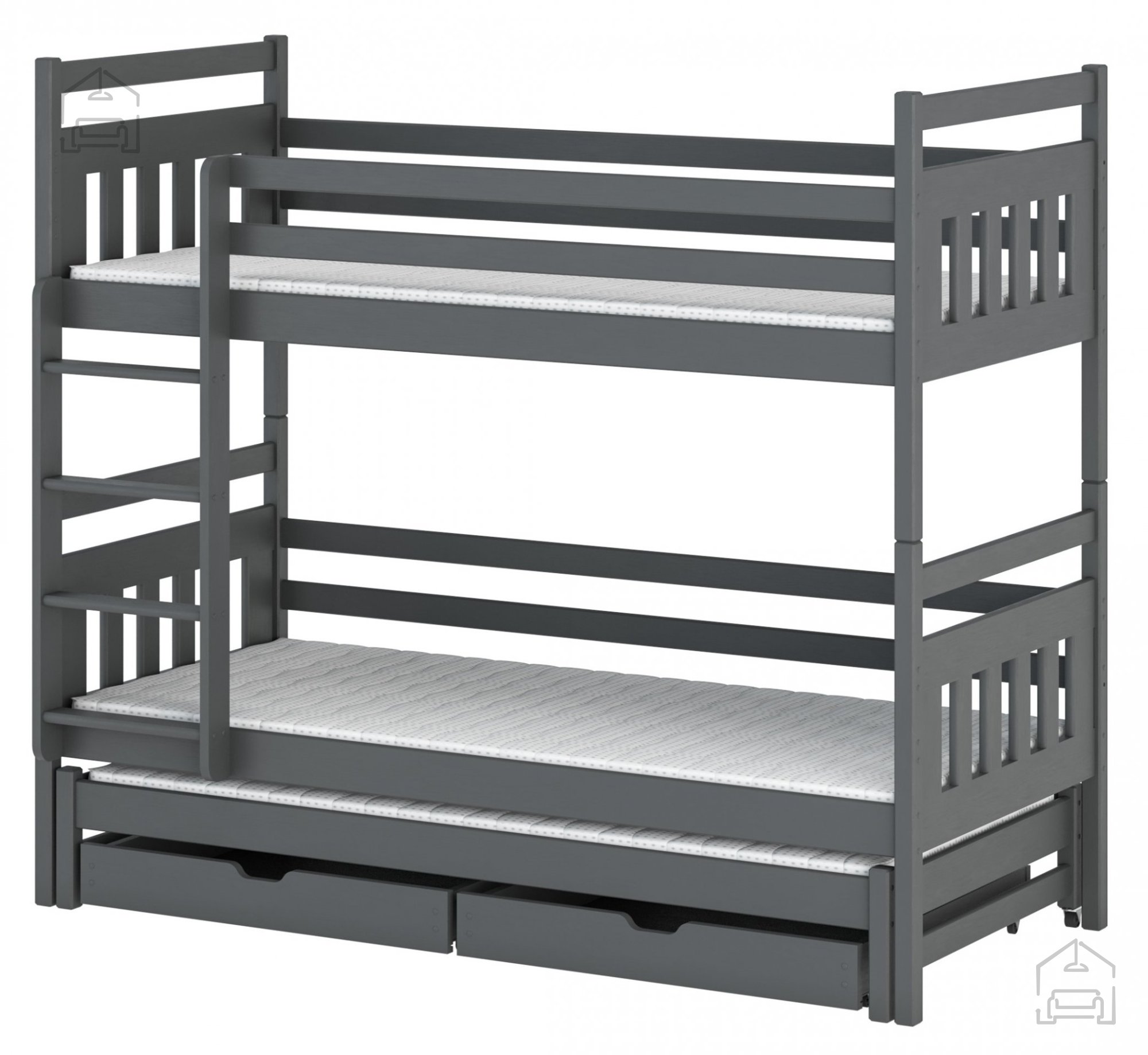 Sodobna otroška postelja z dodatnim ležiščem je namenjena fantom in deklicam. Otroška postelja je narejena tako, da združuje funkcionalnost, modernost in predvsem kakovost in varnost za vašega otroka, ker ima močen okvir iz bora. Praktične dimenzije zagotavljajo, da postelja ne zasede veliko prostora, zato je več prostora za igranje ali učenje. Otroška postelja je narejena iz borovega lesa. Postelja ima prostor za shranjevanje v obliki dveh predalov. | Ležalna površina: 90x200 cm