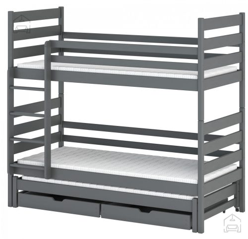 Sodobna otroška postelja z dodatnim ležiščem je namenjena fantom in deklicam. Otroška postelja je narejena tako, da združuje funkcionalnost, modernost in predvsem kakovost in varnost za vašega otroka, ker ima močen okvir iz bora. Praktične dimenzije zagotavljajo, da postelja ne zasede veliko prostora, zato je več prostora za igranje ali učenje. Otroška postelja je narejena iz borovega lesa. Postelja ima prostor za shranjevanje v obliki dveh predalov. | Ležalna površina: 90x200 cm