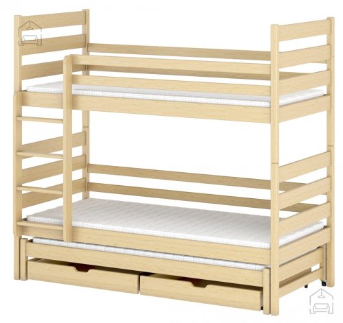 Sodobna otroška postelja z dodatnim ležiščem je namenjena fantom in deklicam. Otroška postelja je narejena tako, da združuje funkcionalnost, modernost in predvsem kakovost in varnost za vašega otroka, ker ima močen okvir iz bora. Praktične dimenzije zagotavljajo, da postelja ne zasede veliko prostora, zato je več prostora za igranje ali učenje. Otroška postelja je narejena iz borovega lesa. Postelja ima prostor za shranjevanje v obliki dveh predalov.