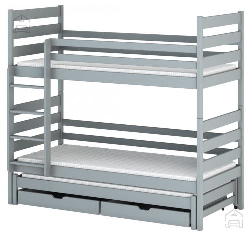 Sodobna otroška postelja z dodatnim ležiščem je namenjena fantom in deklicam. Otroška postelja je narejena tako, da združuje funkcionalnost, modernost in predvsem kakovost in varnost za vašega otroka, ker ima močen okvir iz bora. Praktične dimenzije zagotavljajo, da postelja ne zasede veliko prostora, zato je več prostora za igranje ali učenje. Otroška postelja je narejena iz borovega lesa. Postelja ima prostor za shranjevanje v obliki dveh predalov. | Material korpusa: Laminirana plošča