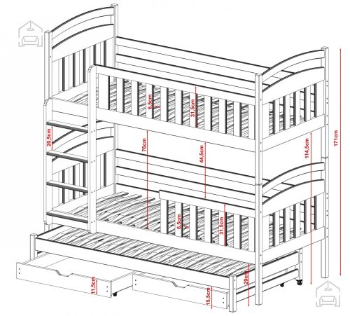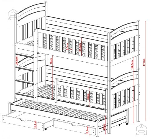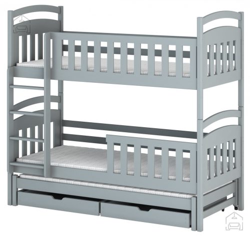Sodobna otroška postelja z dodatnim ležiščem je namenjena fantom in deklicam. Otroška postelja je narejena tako, da združuje funkcionalnost, modernost in predvsem kakovost in varnost za vašega otroka, ker ima močen okvir iz bora. Praktične dimenzije zagotavljajo, da postelja ne zasede veliko prostora, zato je več prostora za igranje ali učenje. Otroška postelja je narejena iz borovega lesa. Postelja ima prostor za shranjevanje v obliki dveh predalov. | Material korpusa: Laminirana plošča
