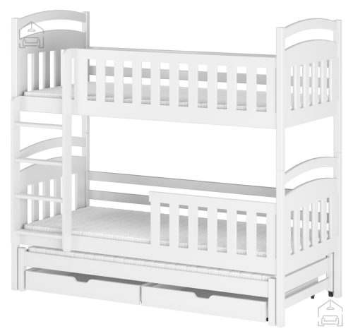 Sodobna otroška postelja z dodatnim ležiščem je namenjena fantom in deklicam. Otroška postelja je narejena tako, da združuje funkcionalnost, modernost in predvsem kakovost in varnost za vašega otroka, ker ima močen okvir iz bora. Praktične dimenzije zagotavljajo, da postelja ne zasede veliko prostora, zato je več prostora za igranje ali učenje. Otroška postelja je narejena iz borovega lesa. Postelja ima prostor za shranjevanje v obliki dveh predalov. | Material korpusa: Laminirana plošča