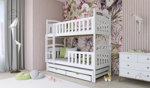 Sodobna otroška postelja z dodatnim ležiščem je namenjena fantom in deklicam. Otroška postelja je narejena tako, da združuje funkcionalnost, modernost in predvsem kakovost in varnost za vašega otroka, ker ima močen okvir iz bora. Praktične dimenzije zagotavljajo, da postelja ne zasede veliko prostora, zato je več prostora za igranje ali učenje. Otroška postelja je narejena iz borovega lesa. Postelja ima prostor za shranjevanje v obliki dveh predalov. | Material: Iverna plošča, MDF