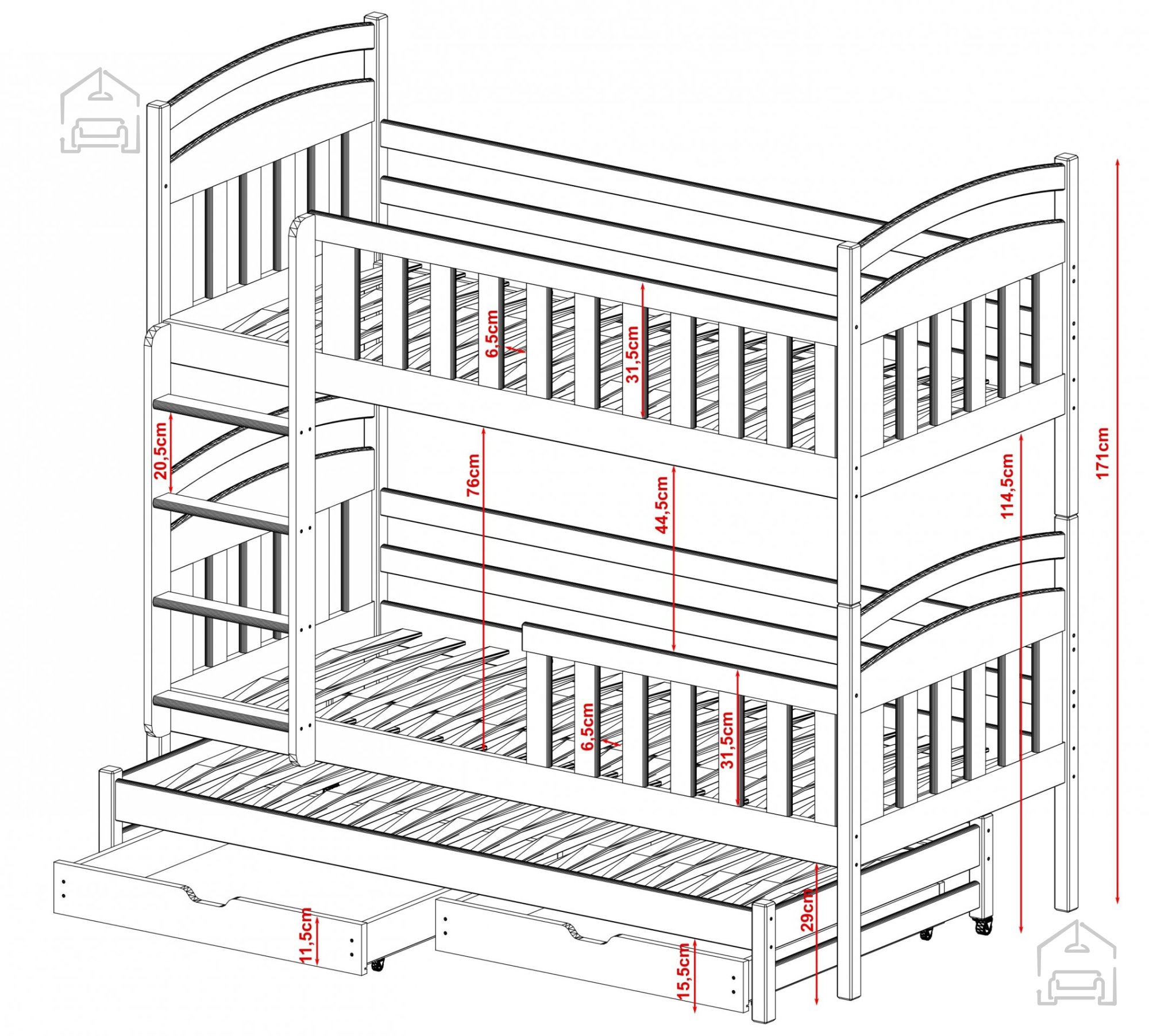 - Certificiran je kot varen za otroke, pri čemer vsaka postelja prenese obremenitev do 100 kg. Vključuje tudi pregrado, ki je lahko nameščena navpično fiksno ali odstranljivo, ter navpično lestev za enostaven dostop. Dodatno, vgrajeni predali iz ivernih plošč zagotavljajo dodaten prostor za shranjevanje posteljnine ali igrač.