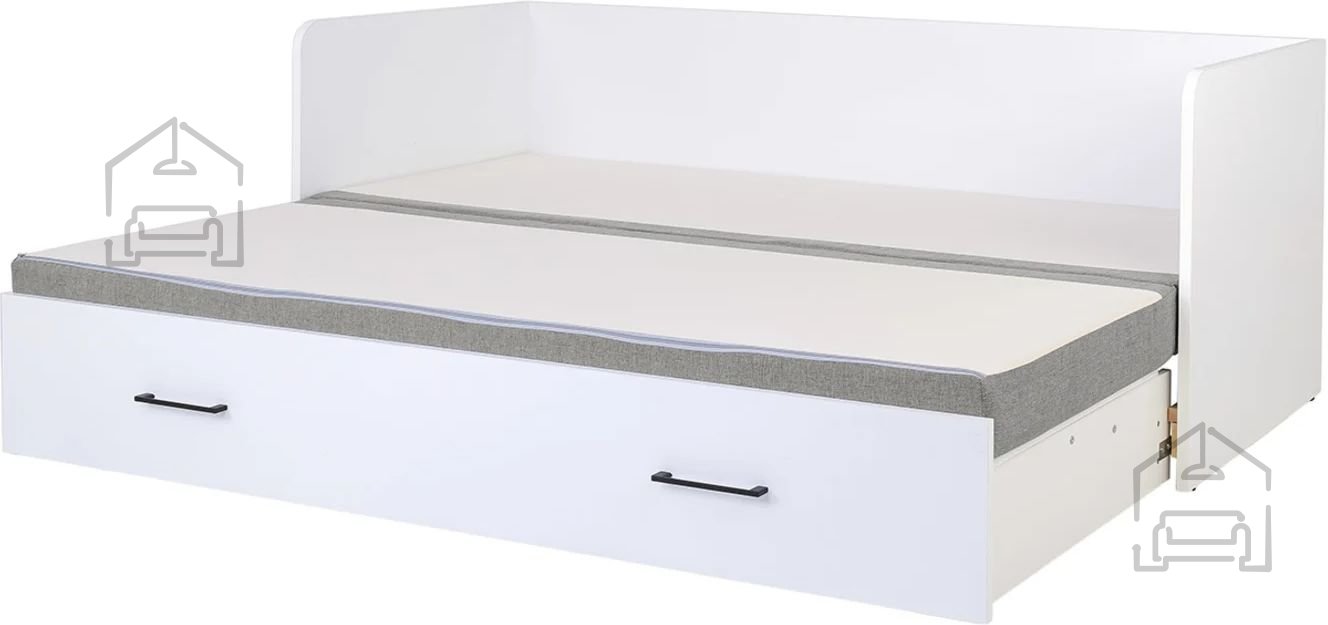 Sodobna otroška postelja z dodatnim ležiščem je namenjena fantom in deklicam. Otroška postelja je narejena tako, da združuje funkcionalnost, modernost in predvsem kakovost in varnost za vašega otroka, ker ima močen okvir iz bora. Praktične dimenzije zagotavljajo, da postelja ne zasede veliko prostora, zato je več prostora za igranje ali učenje. Otroška postelja je narejena iz borovega lesa. Postelja ima prostor za shranjevanje v obliki dveh predalov. | Material: laminirana iverna plošča, 16 mm