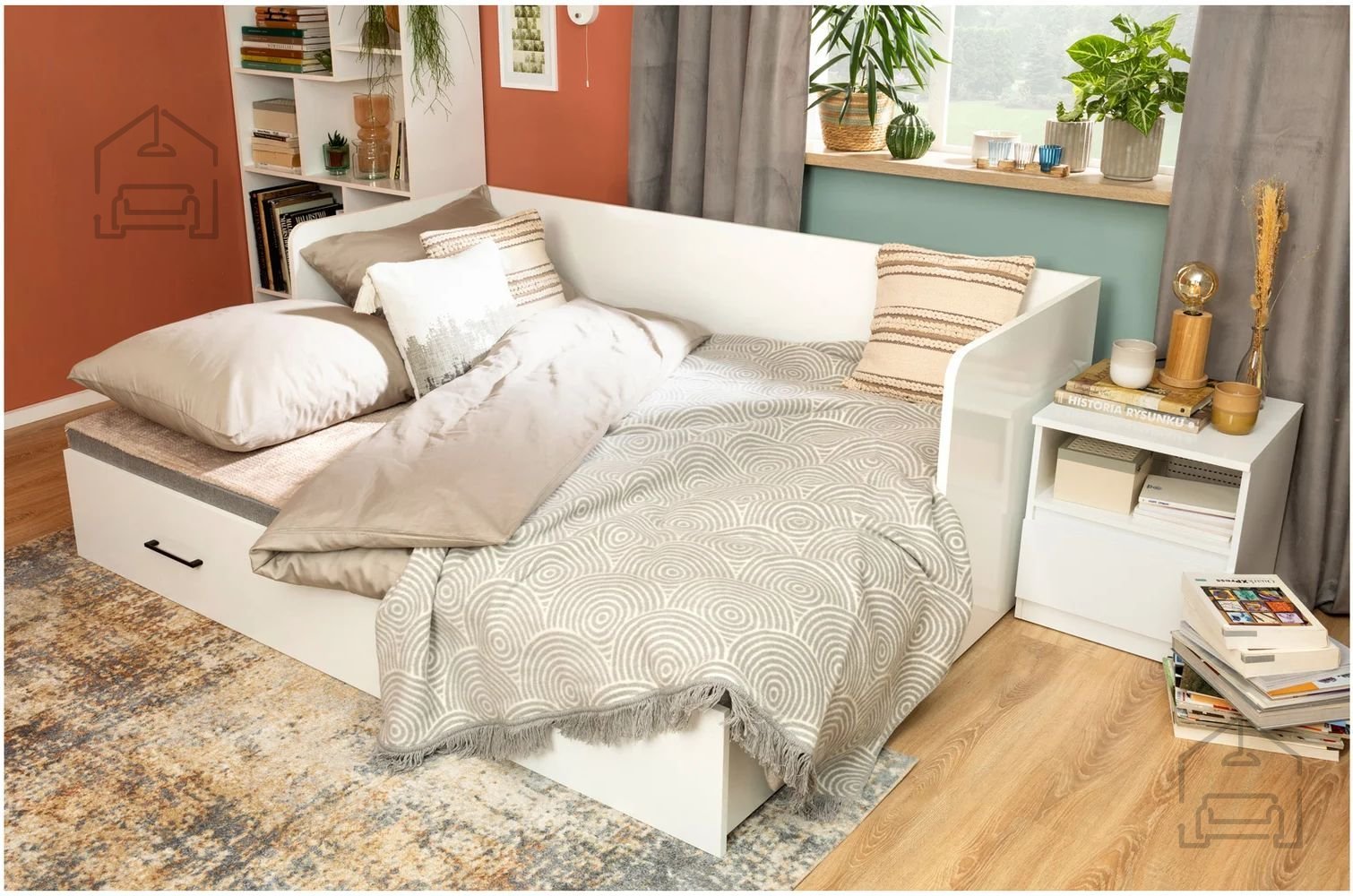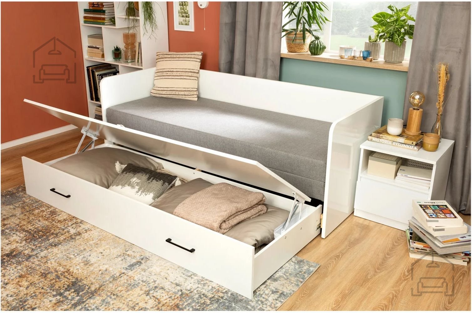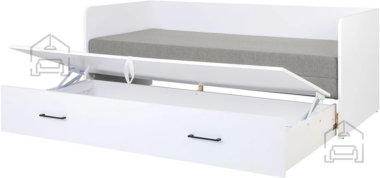 - posteljo s predalom, ležišče (daybed) z zabojem za posteljnino.