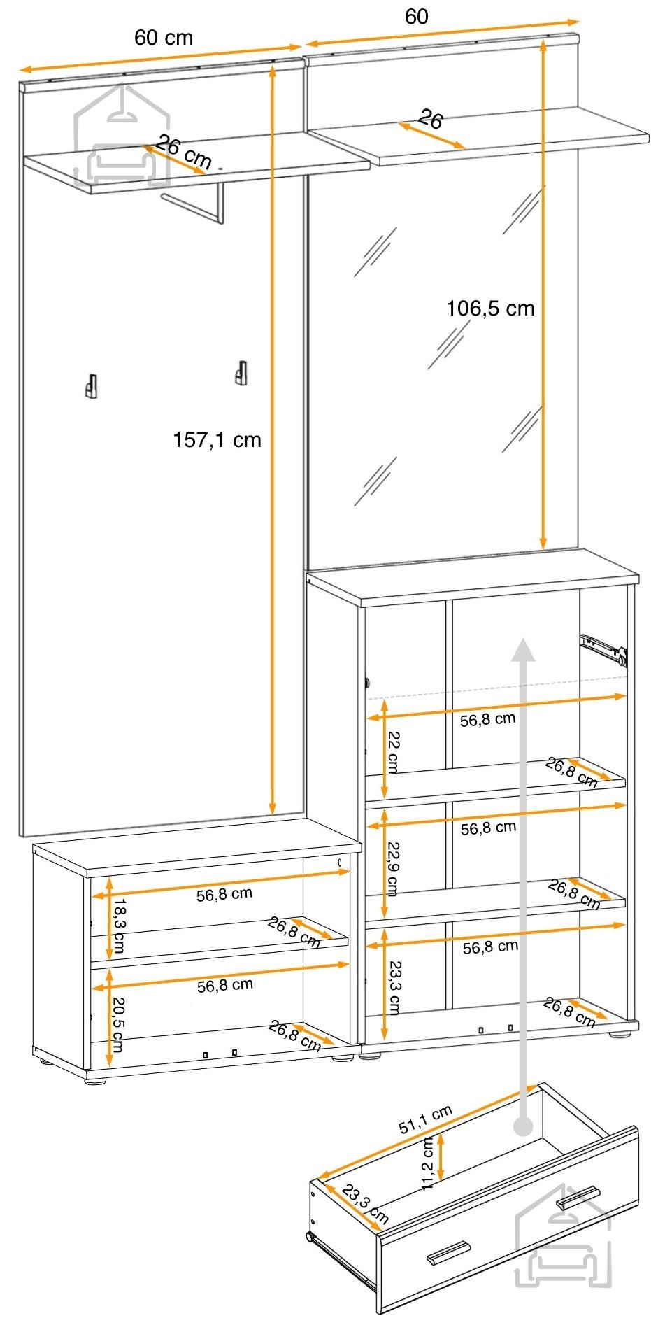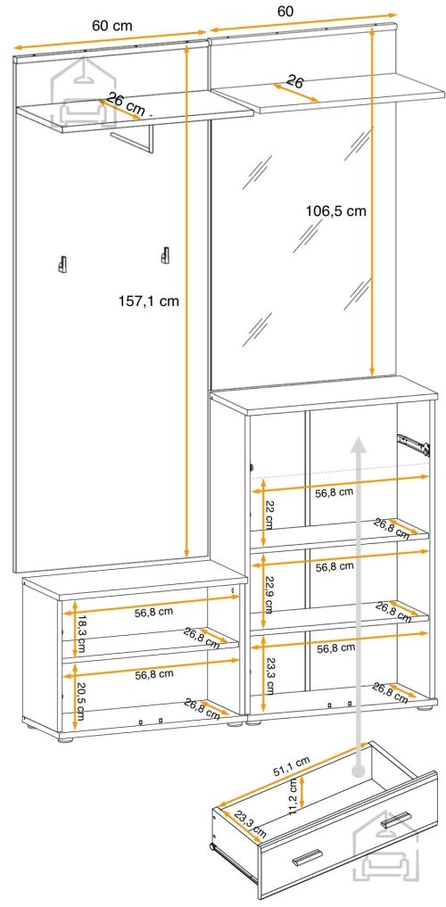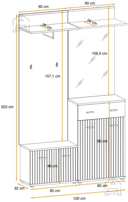 - 1x Obešalnik s polico in obešalno palico. Dimenzije: 60x157x32 cm.