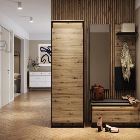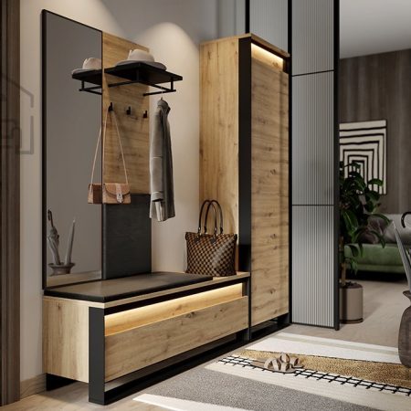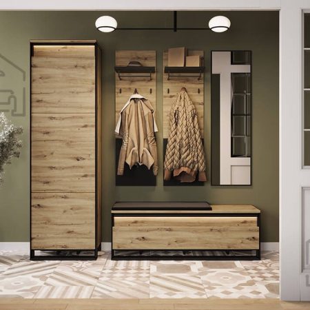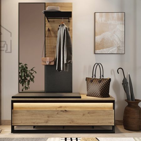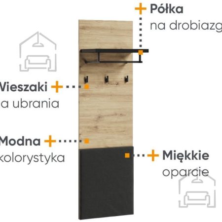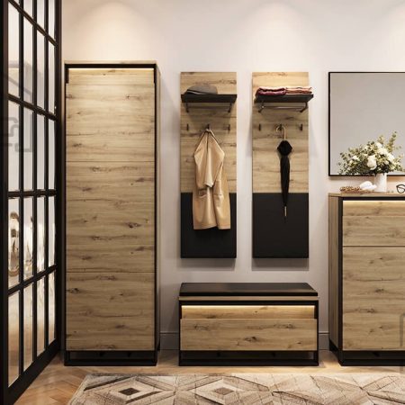 Naš stenski obešalnik za predsobo ni samo funkcionalen, ampak tudi eleganten. Preprost in moderen dizajn obešalnika bo ustvaril prijetno vzdušje na vašem hodniku. Modna kombinacija črne barve z obrtniškimi hrastovimi dekorji naredi pohištvo izjemno brezčasno.