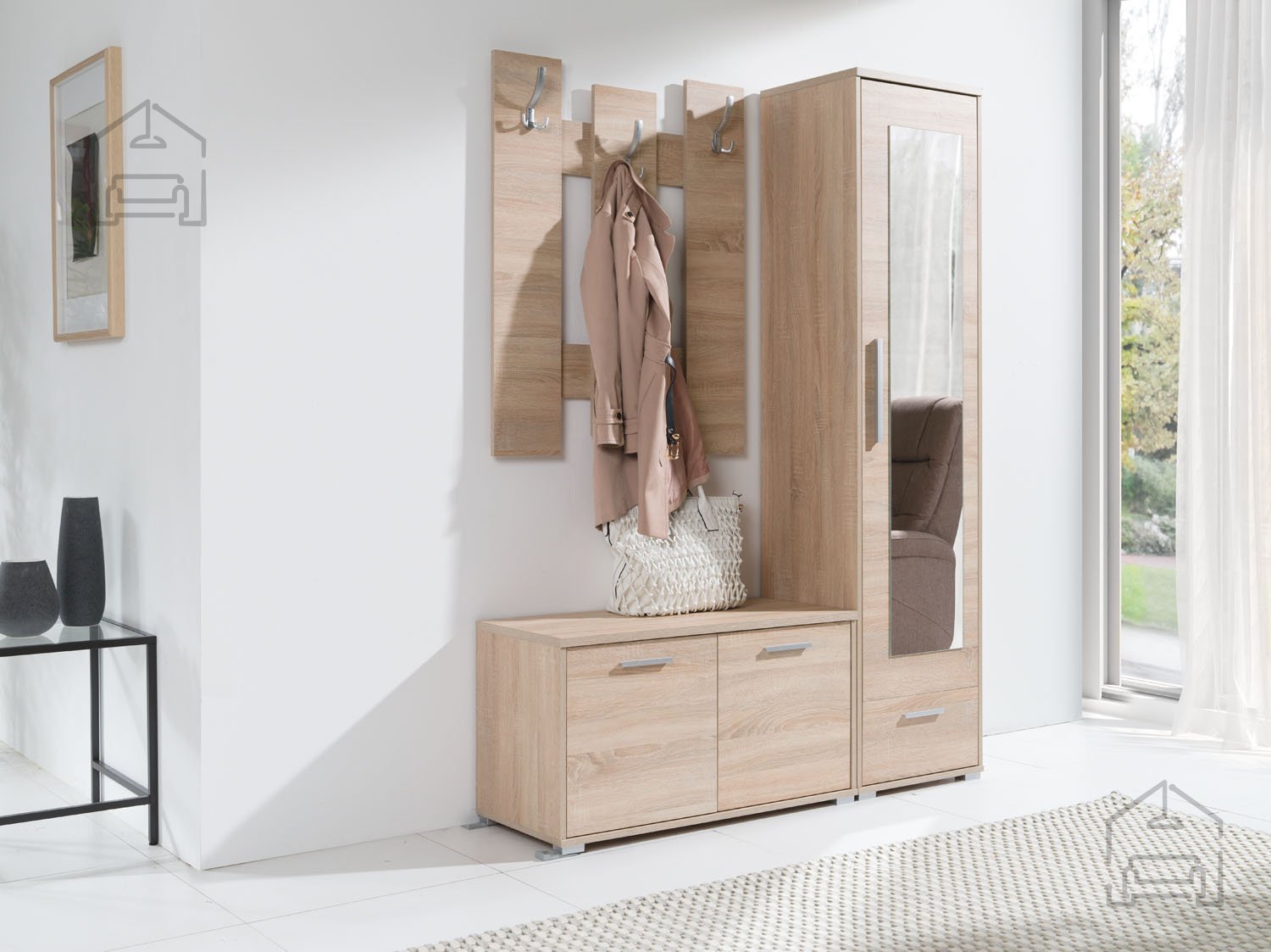 Poleg precejšnjega prostora za shranjevanje, za kar poskrbijo tri omare in dva predala, so tu še obešalniki, na katere boste lahko odlagali jakne in budne. Za mirnejši odhod od doma bo poskrbelo ogledalo, v katerem boste lahko preverili, če je na vas vse tako, kot mora biti. Pod ogledalom bo dovolj prostora za odlaganje telefona, ključev, kap, klobukov ipd. Nad ogledalom in obešalnikom sta skriti še dve stenski polici, na katero boste lahko odlagali stvari, ki jih ne potrebujete tako zelo pogosto. Za udobno obuvanje in zavezovanje vezalk na čevljih bo poskrbela klop z mehko blazino (blazina ob doplačilu). Komplet je izdelan iz iverala in je v barvi hrasta.