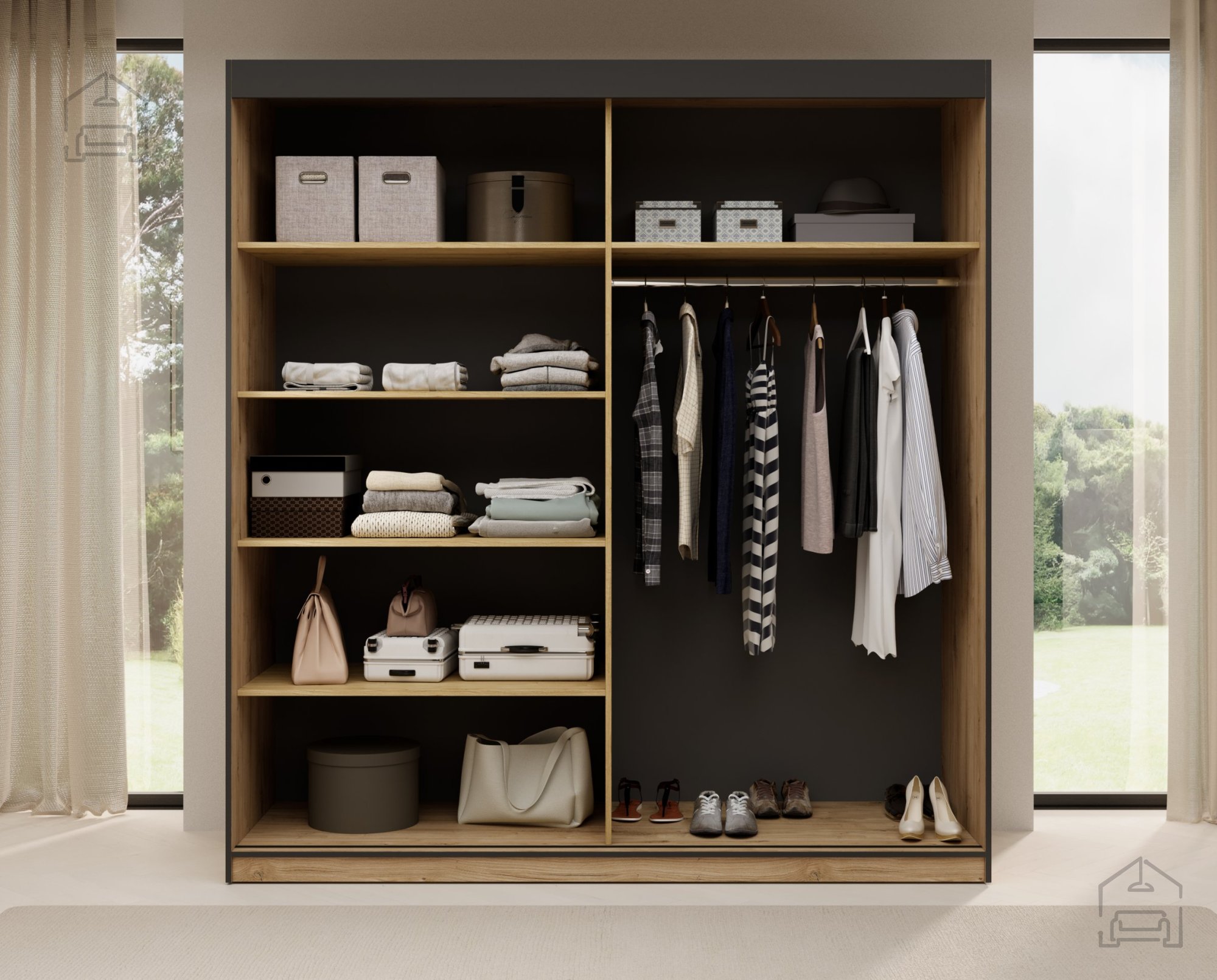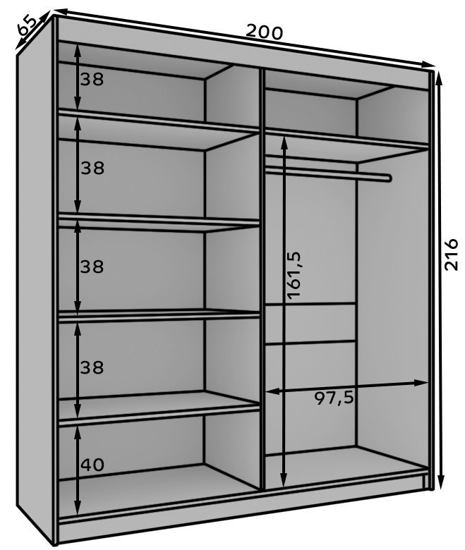 Barva: črna/hrastDimenzije: 2000x2160x650 mm Odkrijte našo prostorno drsno omaro Atson 200 v klasični barvi hrasta, ki odlično združuje eleganco in funkcionalnost. Ta elegantna garderobna omara ne bo samo popestrila estetike vašega interierja, ampak vam bo ponudila tudi veliko prostora za shranjevanje. | Material: iveral