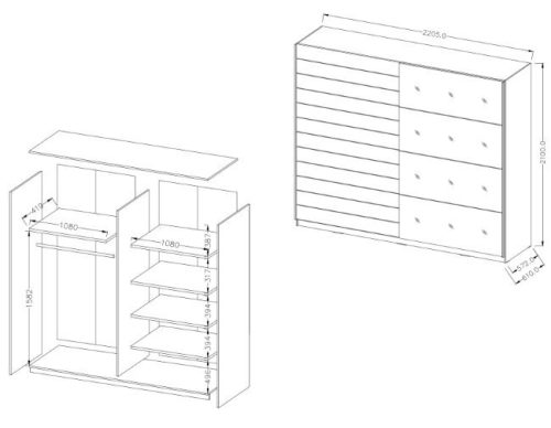 Dimenzije: 2200x2100x610 mm Garderobna omara Galaxy 220 cm - carbon hrast - 24CBEA68Predstavljamo vam garderobno omaro Galaxy 220 cm, ki bo vašo spalnico ali garderobni prostor dvignila na povsem novo raven elegance in funkcionalnosti. Ta impresivna omara, izdelana iz laminirane plošče debeline 16 mm, je odličen izbor za vse, ki cenijo kakovost, vzdržljivost in estetski videz. Na voljo v prefinjeni barvi carbon hrast, prinaša pridih sodobnega pridiha v vsak dom. Dimenzije in prostornostGarderobna omara Galaxy meri 220 cm v širino, 61 cm v globino in 210 cm v višino. S temi prostornimi dimenzijami nudi obilico prostora za organizacijo vaših oblačil, obutve in drugih osebnih predmetov. Popolnoma se prilagaja potrebam sodobnega življenjskega sloga, saj omogoča optimalno shranjevanje in enostaven dostop do vaših najljubših kosov garderobe. Material in izdelavaIzdelana v priznani tovarni Helvetia meble s sedežem na Poljskem, je Garderobna omara Galaxy sinonim za kakovost in vzdržljivost. Laminirana plošča debeline 16 mm zagotavlja dolgo življenjsko dobo in odpornost na vsakodnevne obrabe. Površina iz carbon hrasta dodaja dodatno eleganco in omogoča enostavno vzdrževanje ter čiščenje. Estetski videz in barvaBarva carbon hrast je izbira, ki nikoli ne gre iz mode. Njena nevtralnost omogoča enostavno integracijo v različne stile notranjega oblikovanja, od klasičnega do modernega. Poleg tega omara Galaxy s svojo prefinjeno zasnovo dopolnjuje vsak prostor, hkrati pa ohranja pridih luksuza. Ključne prednosti