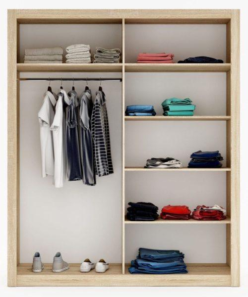 Veliko prostora za shranjevanje: garderobna omara Beta ponuja obilo prostora za shranjevanje, kar omogoča, da vaše oblačila, čevlji in dodatki ostanejo urejeni in organizirani. Njena zasnova vključuje več polic in obešalnih palic, kar zagotavlja prilagodljivost pri shranjevanju različnih vrst oblačil.