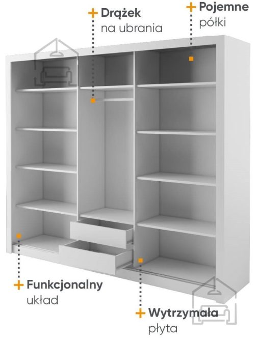 Ustvarite popoln prostor za shranjevanje oblačil! Garderobno omaro lahko prilagodite vašim osebnim potrebam, saj skupaj s komodami predstavlja popoln komplet za spalnico.