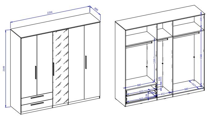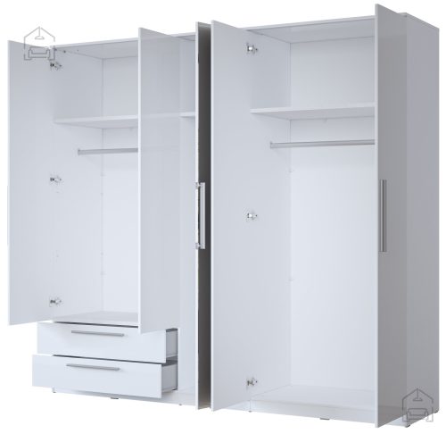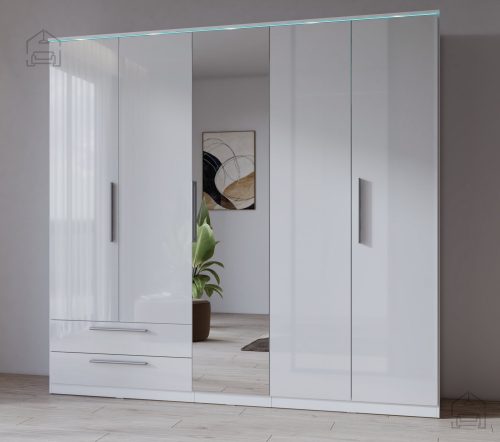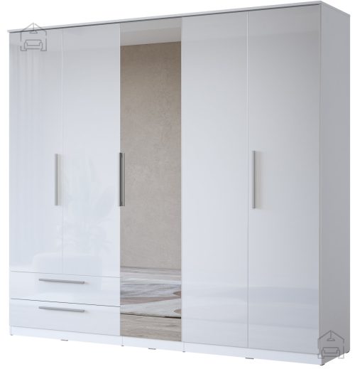 Prostornost in organizacija: omara s petimi vrati ponuja izjemno veliko prostora za shranjevanje vaših oblačil, čevljev in dodatkov. Dva prostorna predala omogočata dodatno shranjevanje manjših predmetov, medtem ko vam ogledalo pomaga pri vsakodnevni pripravi.