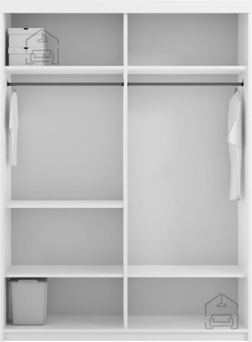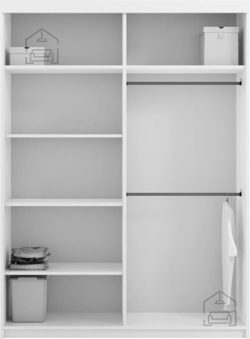 - Prostorna notranjost: s širino 150 cm in globino 62 cm ponuja dovolj prostora za obešanje oblačil, police za dodatke ter predale za manjše predmete.