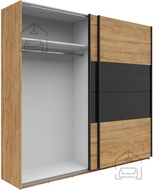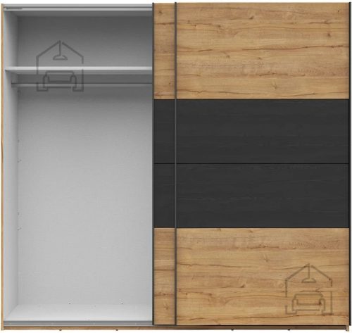 Barvna kombinacija vodnega hrasta in črnega hrasta ponuja velike možnosti za oblikovanje. Takšna zasnova omare se bo prilegala tako v sodobni stil kot tudi dopolnila aranžma v loft slogu. Prostor svoje omare lahko povečate z nakupom 2 namenskih polic, ki so na voljo v nakupni opciji.