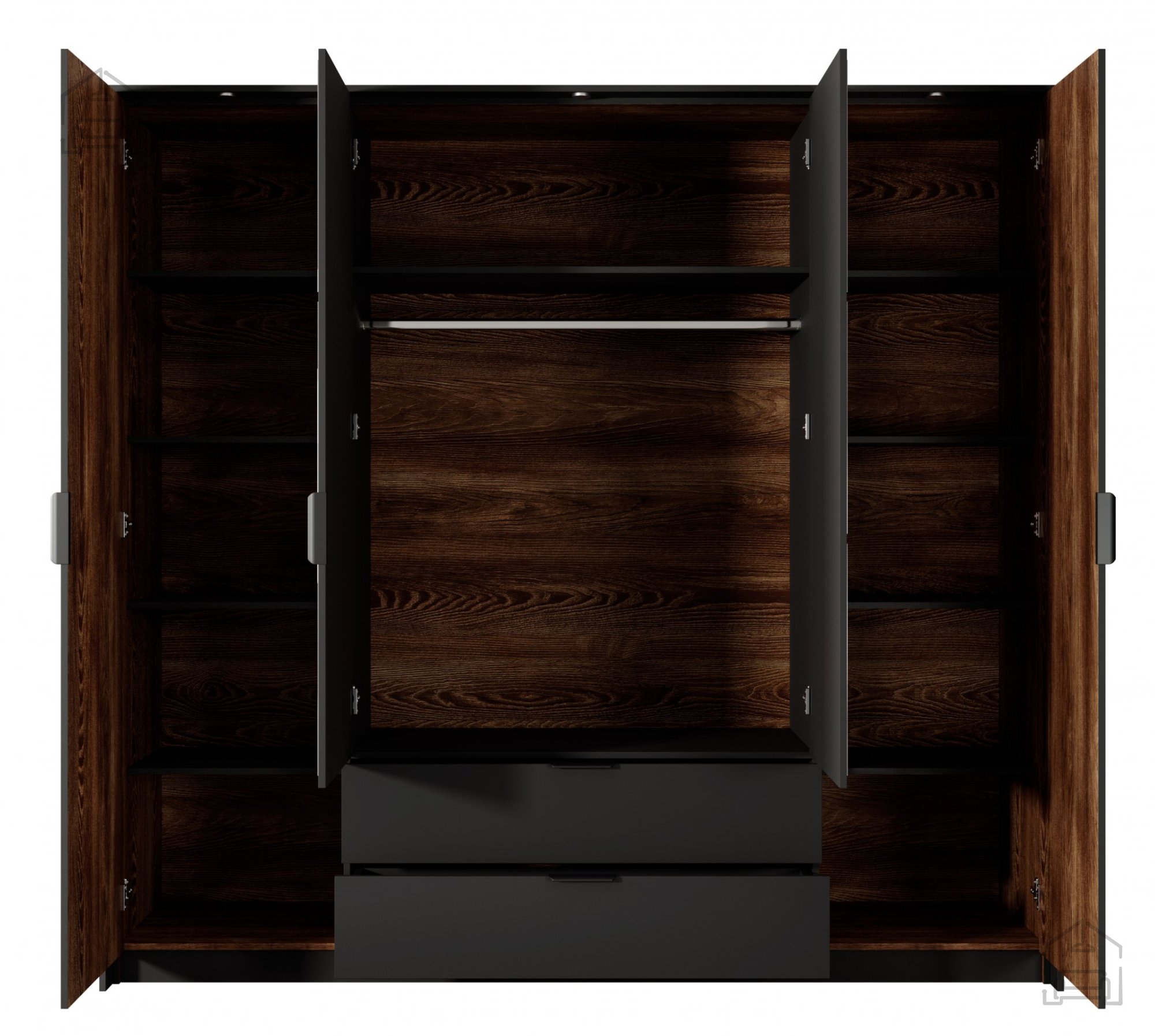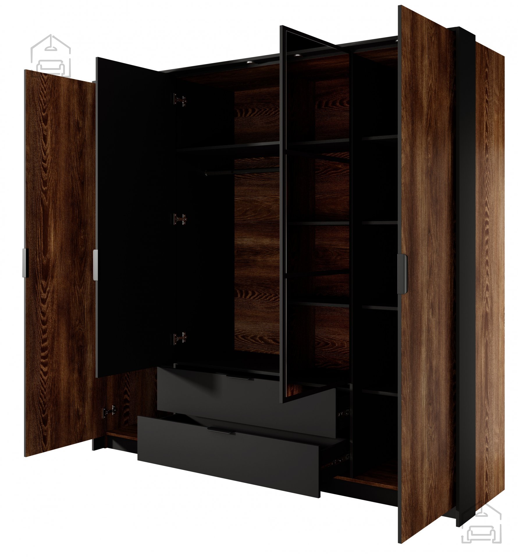 • Elegantna zunanjost: S svojo čisto in sodobno obliko ter harmonično kombinacijo barv antracita in kostanja bo omara dopolnila estetiko vaše spalnice in ji dodala pridih eleganco.