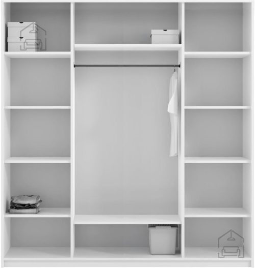 Optimiziran prostor za shranjevanje: z notranjo razporeditvijo, ki vključuje polic in palic za obešanje, lahko enostavno organizirate vaša oblačila, obutev in dodatke. Ogledalo na omari poskrbi za funkcionalnost in vizualno poveča prostor.