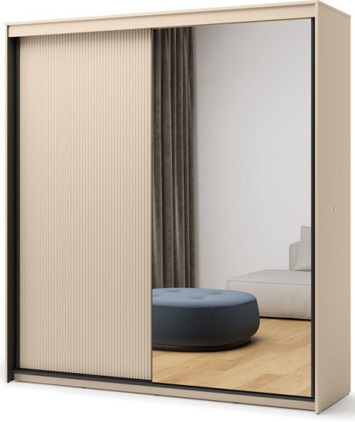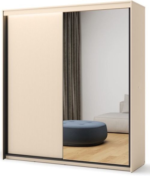 Praktičen dizajn: garderobna omara z drsnimi vrati omogoča enostaven dostop do vsebine, obenem pa prihrani prostor v primerjavi s klasičnimi vrati. Drsna vrata so idealna izbira za manjše prostore, kjer je vsaka dodatna kvadratna metra pomembna.