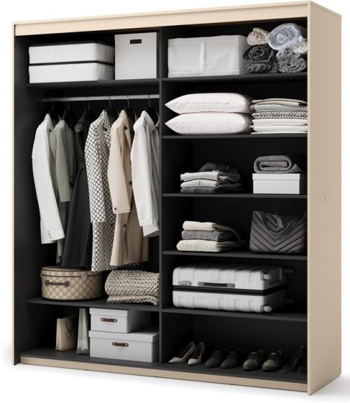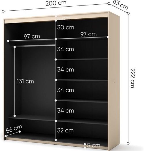 - Prostornost in funkcionalnost: z višino 222 cm in širino 200 cm omara zagotavlja dovolj prostora za shranjevanje tudi največje garderobe. Notranjost vključuje več polic, predalov in obešalnikov, ki omogočajo učinkovito organizacijo.