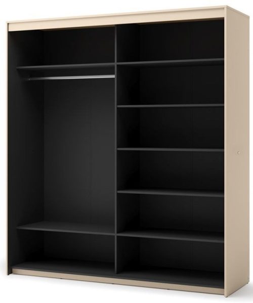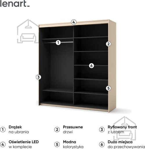 - Praktičnost in prostornost: garderobna omara je opremljena z drsnimi vrati, kar omogoča enostaven dostop in maksimalno izrabo prostora. V notranjosti se nahaja polnilo police in palica za obešanje, kar zagotavlja organiziranost in urejenost vašega garderobnega prostora.