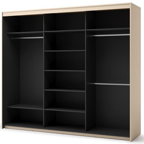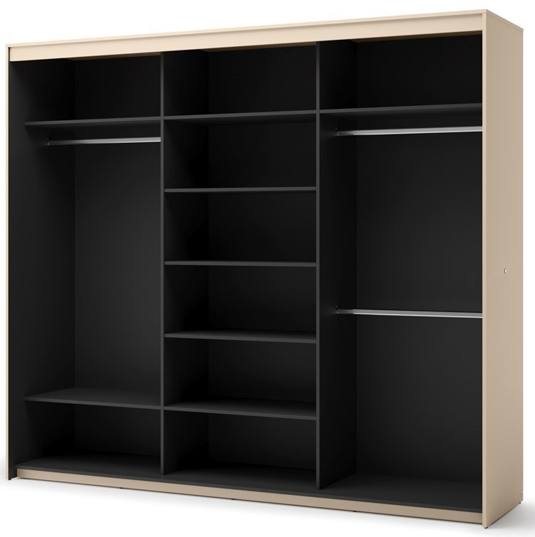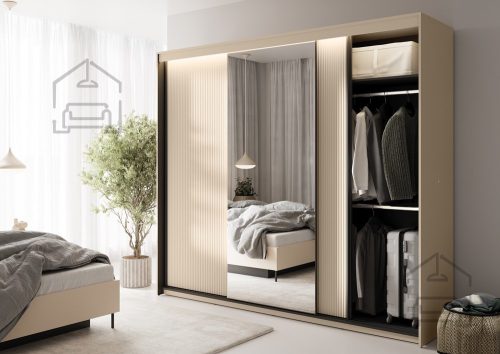 Garderobna omara Trend TS-02 ni le vizualno privlačna, temveč tudi zasnovana z mislijo na največjo funkcionalnost. Z dimenzijami 250x63x222 cm ponuja obilo prostora za shranjevanje, kar je idealno za tiste, ki cenijo red in organizacijo v svojem domu. Omara je izdelana iz trpežnega iverala, kar zagotavlja dolgo življenjsko dobo in odpornost na vsakodnevno uporabo. Barvna kombinacija peščeno bež in črne dodaja sodoben pridih, ki se brezhibno poda v katerokoli spalnico.