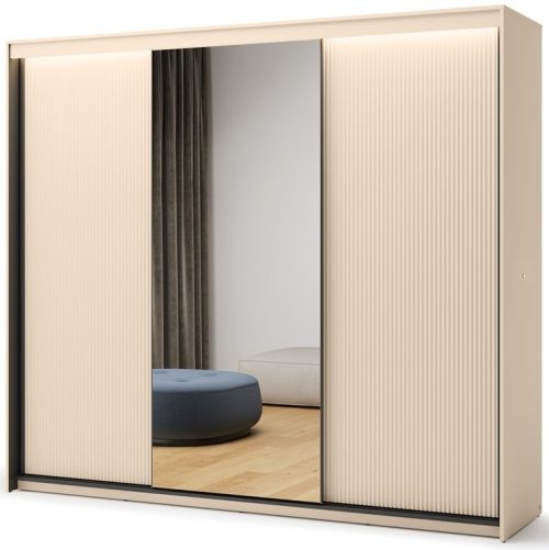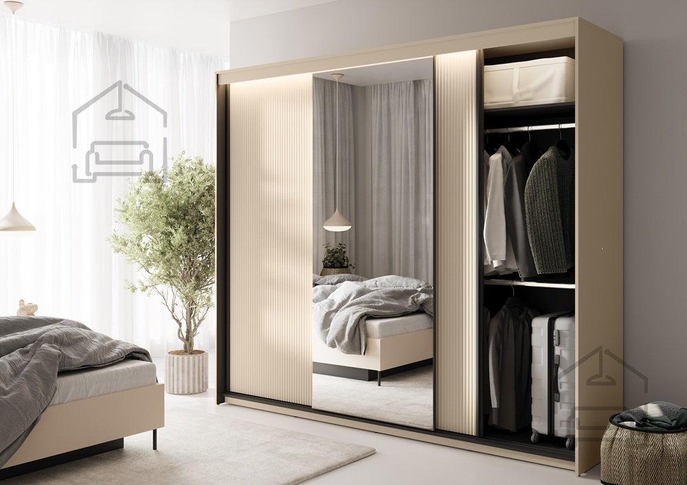 Eleganten dizajn: rebraste fronte in elegantna ogledala na drsnih vratih dodajo pridih luksuza in povečajo občutek prostora.