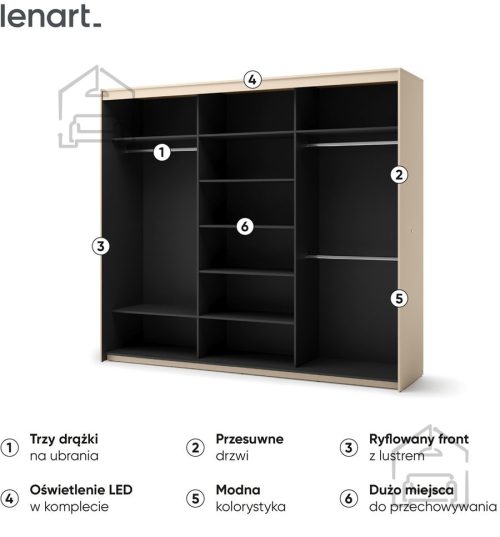Predstavljamo vam garderobno omaro Trend TS-02, ki združuje sodoben dizajn z izjemno praktičnostjo, da zadovolji vse vaše potrebe po shranjevanju. Ta omara je več kot le prostor za vaša oblačila; je kos pohištva, ki bo vašemu domu dodal pridih elegance in sodobnosti. Izdelana v priznani tovarni Lenart na Poljskem, ta omara prinaša evropsko kakovost in stil neposredno v vaše stanovanje.