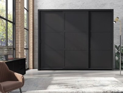 Predstavitev izdelka: garderobna omara z drsnimi vrati Frama 255 cm - črna