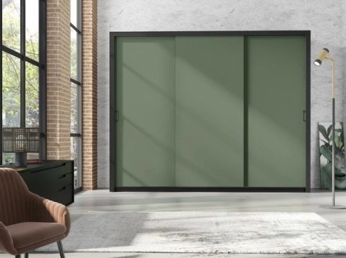 Garderobna omara z drsnimi vrati Frama 255 cm – zelena: eleganca in funkcionalnost v vašem domu