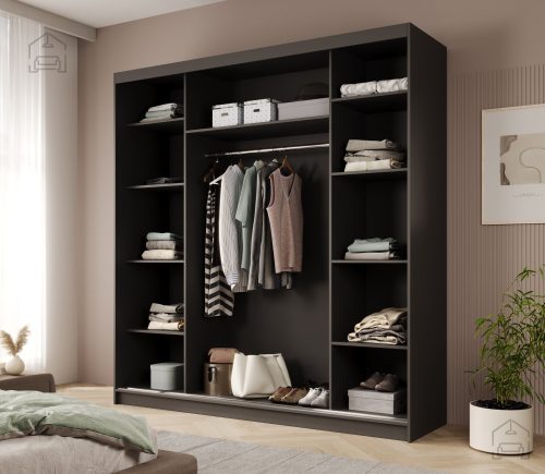- Praktična in funkcionalna zasnova: omara je zasnovana tako, da maksimizira uporabni prostor, hkrati pa ohranja minimalistično estetiko. Njena funkcionalnost omogoča, da se preprosto prilega v različne prostore, ne glede na to, ali gre za spalnico, predsobo ali garderobo.