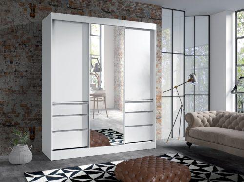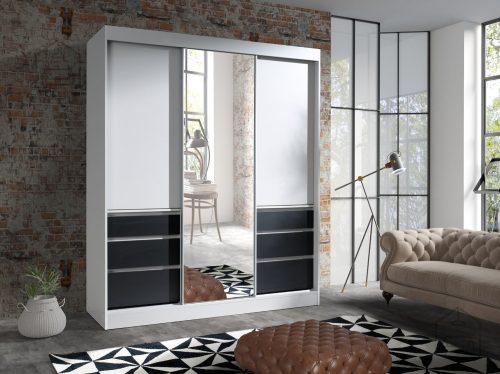 Dimenzije: 1800x2160x650 mm Trivratna garderobna omara Haiti z enim ogledalom bo poskrbela, da boste imeli veliko prostora za shranjevanje oblačil. V notranjosti omare boste na obeh straneh našli dve palici za obešalnike, ki sta popolni za obešanje oblačil, kot so obleke, bluze, srajce, spodaj teh so dodatne predali za shranjevanje. V sredini omare, so police, v katere boste lahko spravili obleke, pokrivala, pa tudi škatle. Garderobna omara z drsnimi vrati Haiti je sanjski kos pohištva za moderno dnevno sobo ali spalnico.