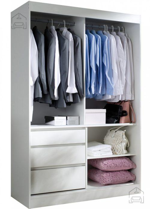 - Praktičnost in prostornost: garderobna omara je opremljena z drsnimi vrati, kar omogoča enostaven dostop in maksimalno izrabo prostora. V notranjosti se nahaja polnilo police in palica za obešanje, kar zagotavlja organiziranost in urejenost vašega garderobnega prostora.