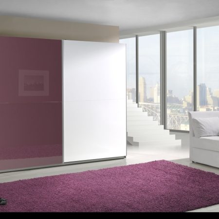 police v notranjosti z aluminijastim profilomDimenzije: 2440x2060x610 mm Garderobna omara z drsnimi vrati Lux 9 - vijolična/bela sijaj: eleganca in funkcionalnost v enem