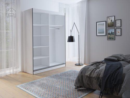 Dimenzije: 1200x2160x650 mm Garderobna omara z drsnimi vrati Oslo II v beli/črni barvi je moderen kos pohištva, ki se bo odlično ujemal z dekorjem vsake spalnice.. Obe sprednji strani sta prekriti z ogledali - zaradi tega je pohištvo primerno za uporabo v majhnih prostorih. Prav ogledala povečajo in optično spremenijo celoten prostor okoli sebe. Funkcionalna notranjost bo odlična za shranjevanje različnih kosov oblačil, tudi tistih, ki jih je treba obesiti.