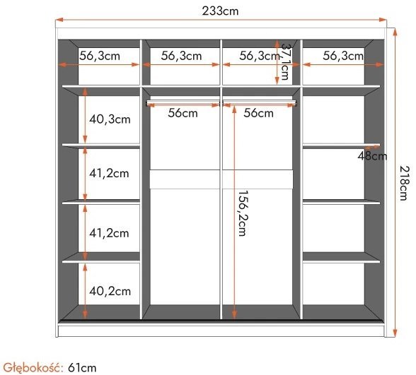 Ta garderobna omara je opremljena s sistemom drsnih vrat, kar omogoča enostavno odpiranje in zapiranje, hkrati pa prihrani dragocen prostor. Razdeljena je na dva dela in vključuje prostorne police ter palico za obešanje oblačil. S tem boste imeli vse svoje obleke in dodatke na enem mestu, kar pripomore k organizaciji in preglednosti.