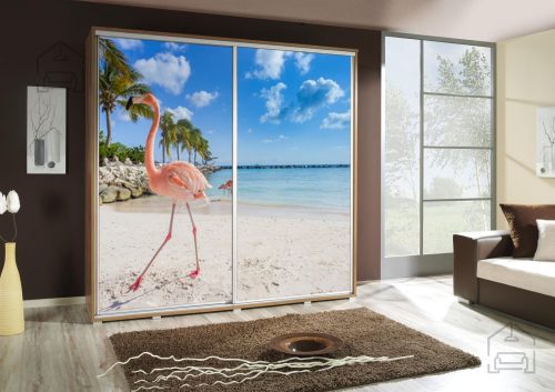 Garderobna omara z drsnimi vrati z grafiko Flamingo 1 Penelopa je več kot le praktičen kos pohištva. Je izraz vaše osebnosti, ki združuje funkcionalnost, stil in kakovost. Izdelana z največjo skrbnostjo in pozornostjo do detajlov v tovarni Maridex, ta omara ponuja rešitev za shranjevanje, ki vas ne bo razočarala. Izberite to omaro in uživajte v prostoru, ki združuje lepoto in praktičnost v popolni harmoniji. | Material: iverna plošča, prevlečena s folijo