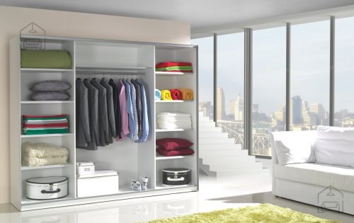 Notranjost omare je premišljeno zasnovana z več policami, ki so okrepljene z aluminijastim profilom. To omogoča učinkovito organizacijo oblačil, čevljev in dodatkov, kar olajša vzdrževanje reda v vašem domu. Aluminijasti ročaji dodajo eleganten zaključek in poenostavijo vsakodnevno uporabo.