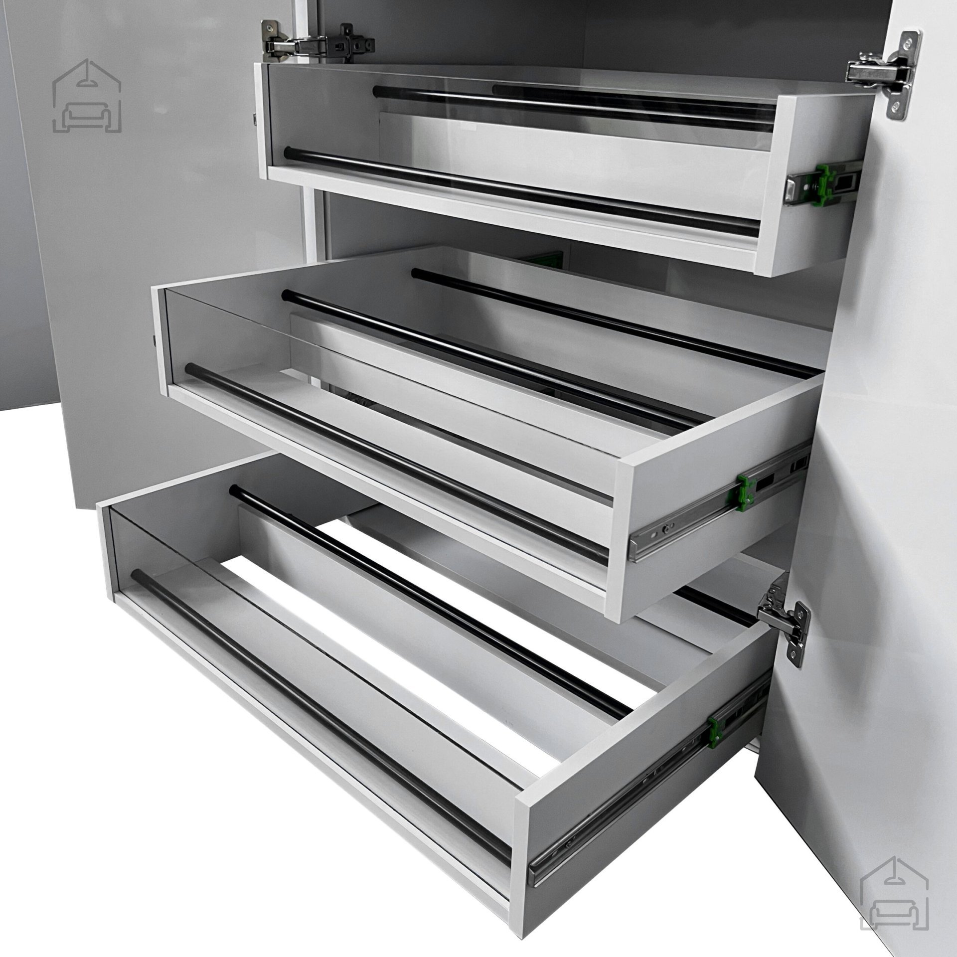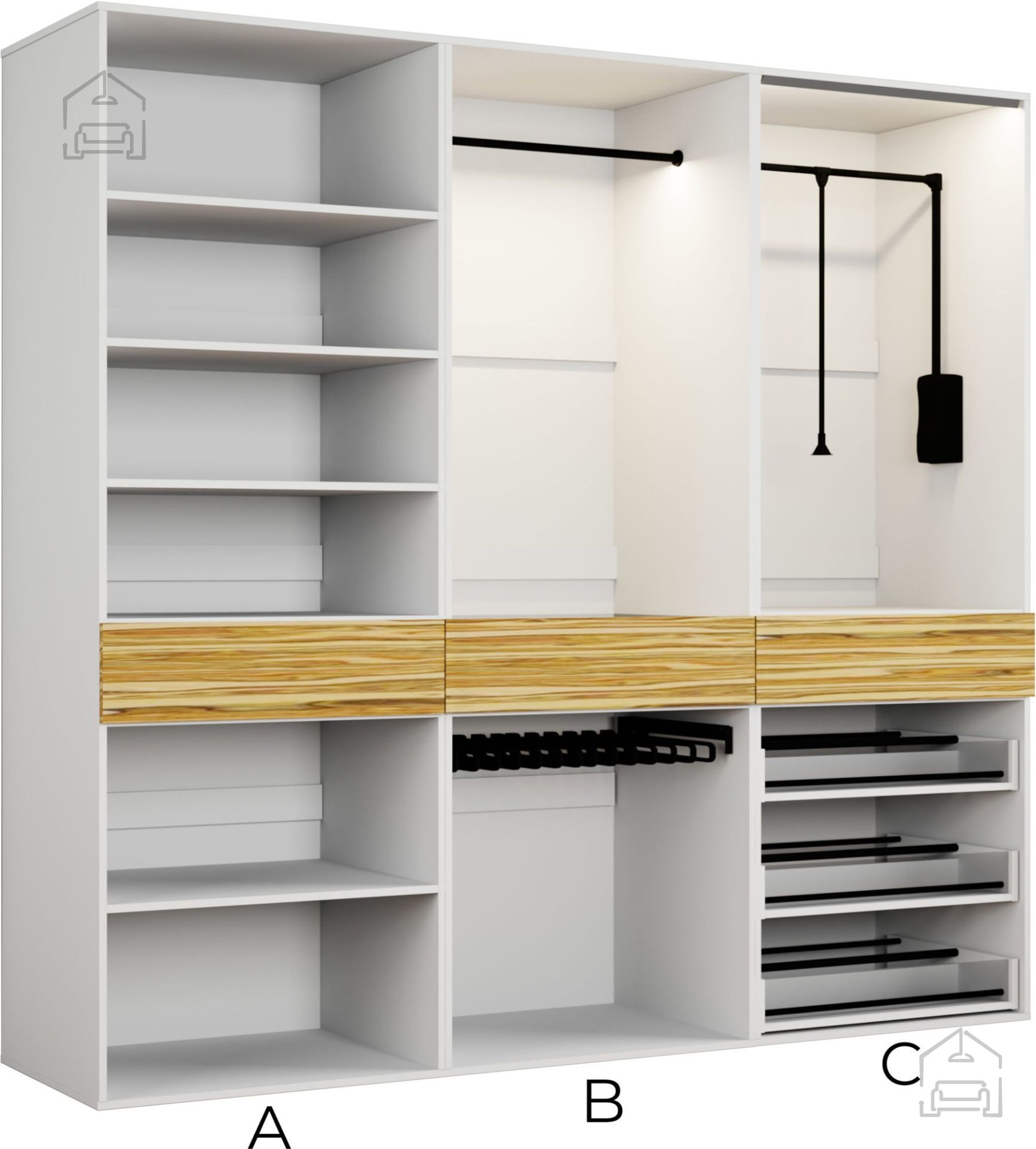 Prilagodljivost: zahvaljujoč modularni zasnovi lahko omaro enostavno prilagodite svojim potrebam. Spreminjajte razporeditev polic, dodajajte ali odstranjujte module ter ustvarite popoln prostor za shranjevanje vaših oblačil in dodatkov.
