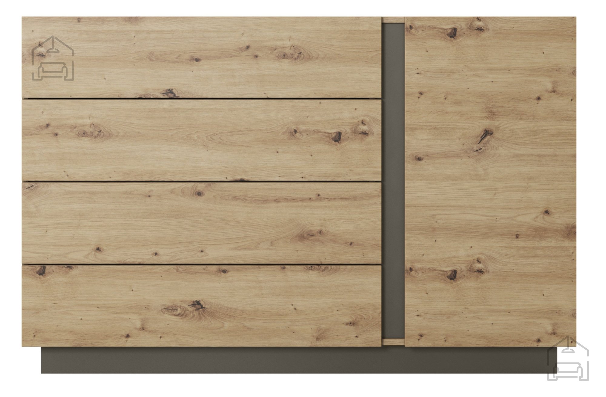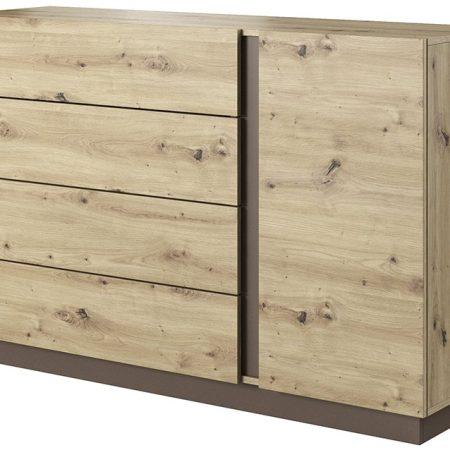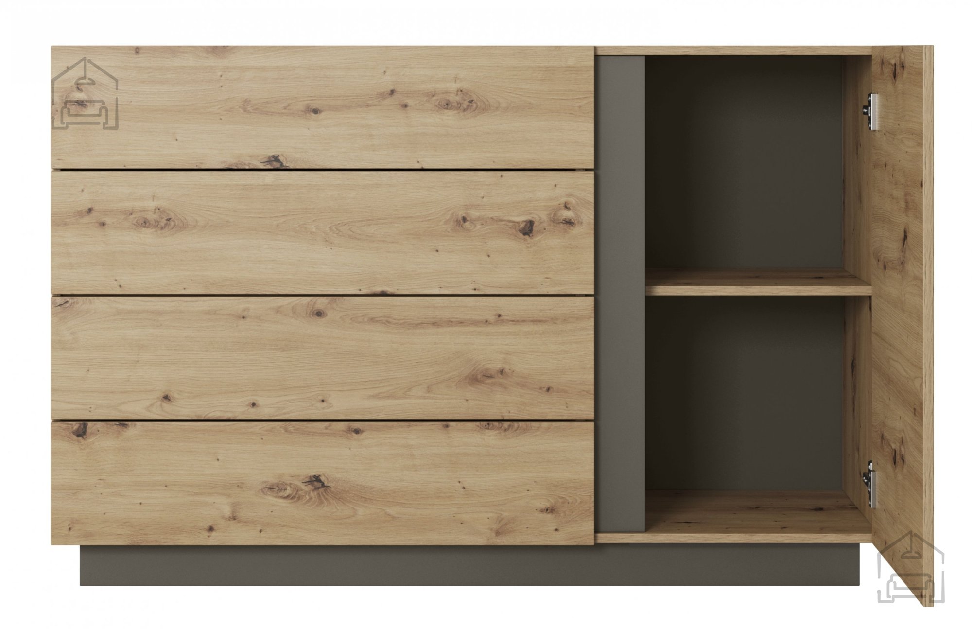 Z 4 predali, ki se nahajajo na sredini, in z 1 omaro na vsaki strani, komoda omogoča učinkovito shranjevanje vaših potrebščin. Predali so idealni za organizacijo manjših predmetov, medtem ko omare nudijo prostor za večje predmete, kot so knjige, posode ali drugi gospodinjski pripomočki.