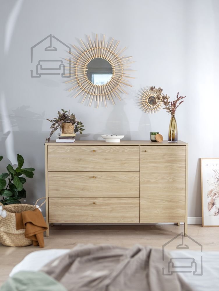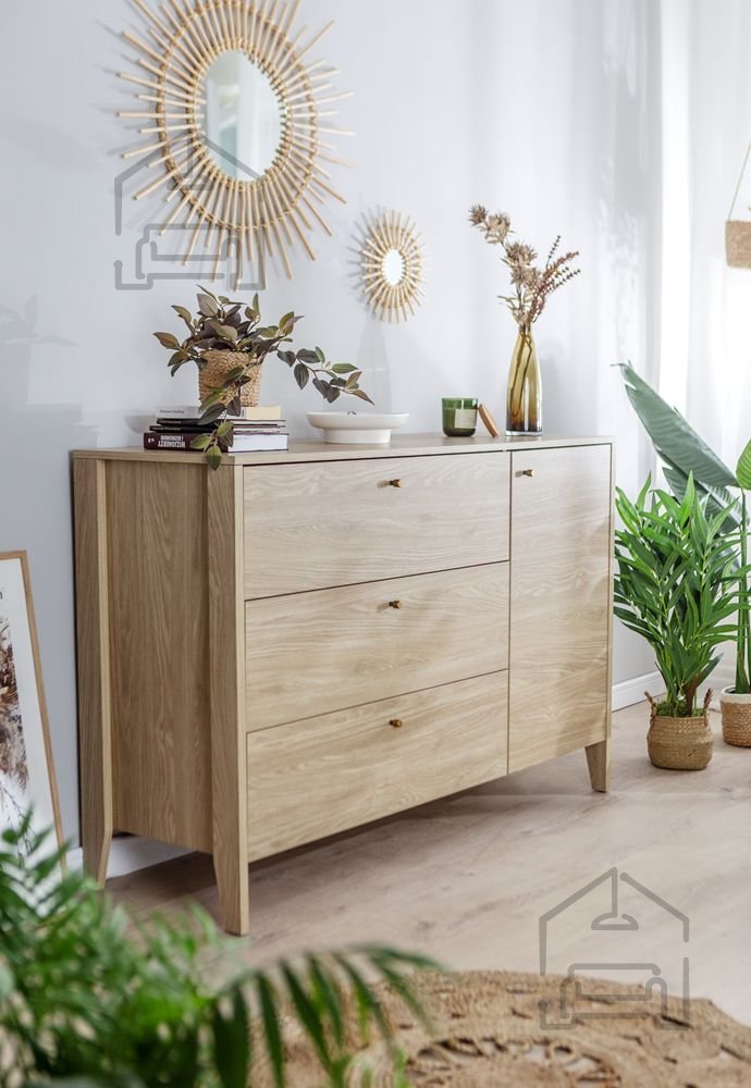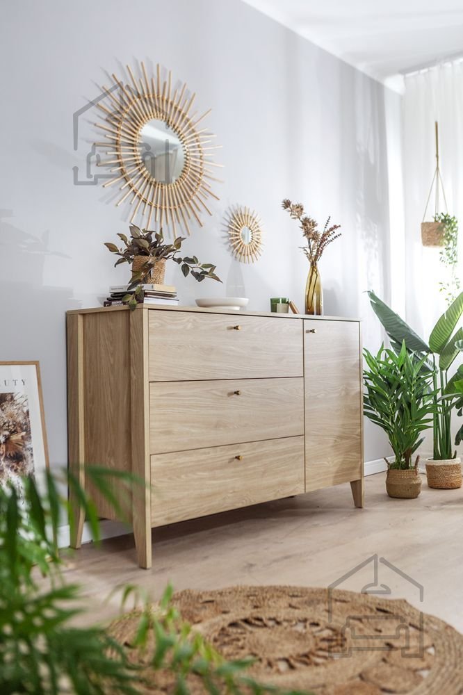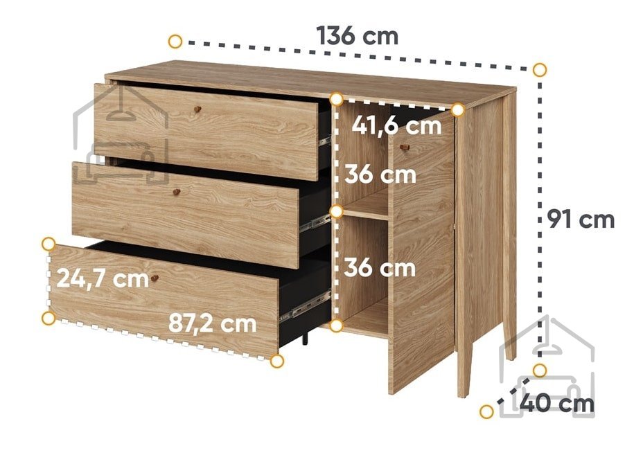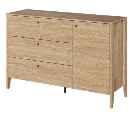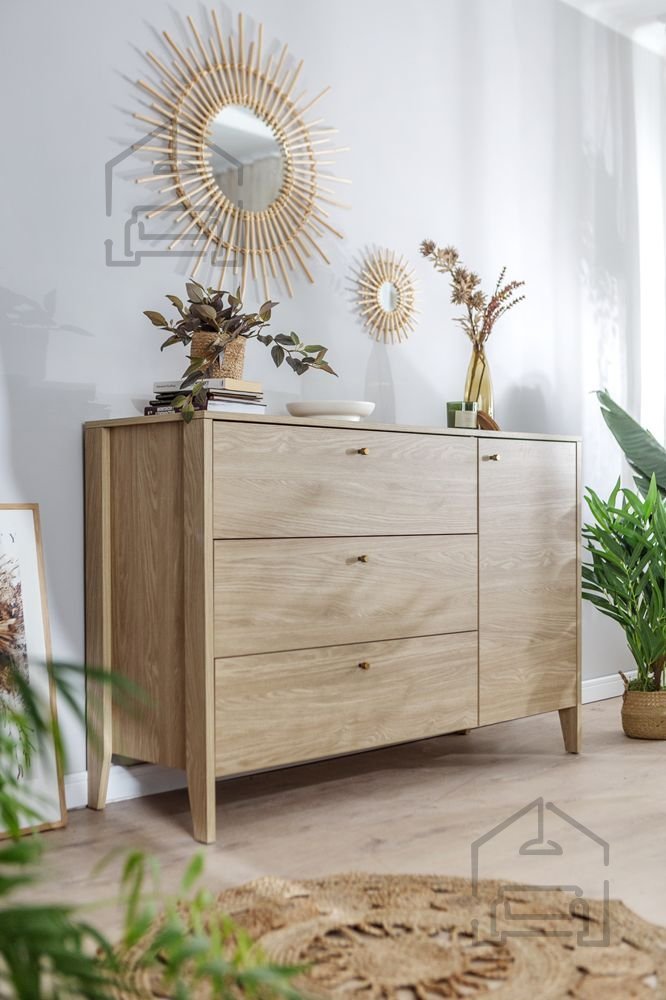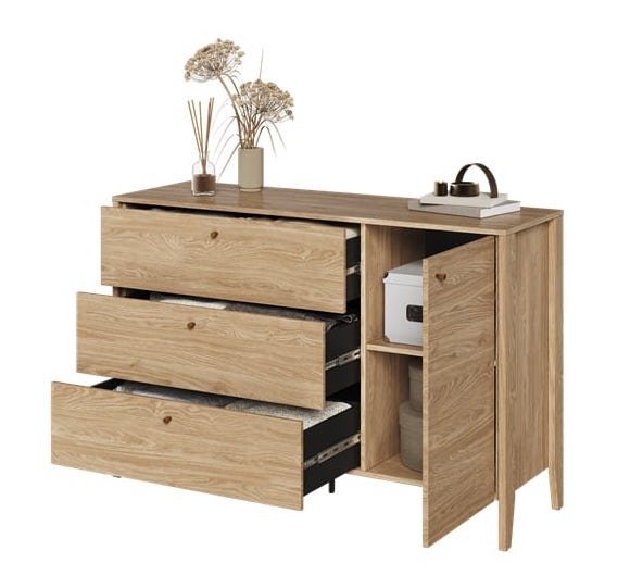 Barva: Oljen hrastDimenzije: 1360x910x450 mm Moderna komoda, ki nudi veliko prostora za shranjevanje najpotrebnejših stvari, je absolutni must have v vsaki spalnici. Če želite, da pohištvo poleg čisto funkcionalnih prednosti zagotavlja tudi najboljšo estetsko izkušnjo, je komoda CZ-04 iz kolekcije Cozy predlog prav za vas. Naša moderna komoda je kombinacija zanimivega dizajna in maksimalne funkcionalnosti. CZ-04 je prava oda modernosti. Njene minimalistične linije, geometrijske oblike in skrbna končna obdelava bodo v vašo notranjost vnesle svež dih elegance. To je kos pohištva, ki se popolnoma ujema s sodobnimi trendi. Kos pohištva v odtenku oljenega hrasta ogreje prostor in ustvari prijetno vzdušje. Majhni, a priročni ročaji predalov in vrat nežno poudarijo umirjen značaj pohištva. Zahvaljujoč komodi boste imeli prostor za shranjevanje svojih potrebščin. Trije prostorni predali in polica, ki se nahajajo v prostoru, zaprtem z enimi vrati, vam omogočajo organiziranje oblačil, knjig in dodatkov, tako da je vse enostavno dostopno. Na vrhu je mizna plošča, kamor lahko postavite fotografije, lučko ali svoje najljubše okraske. To je idealna rešitev za tiste, ki cenijo red in funkcionalnost. Moderna komoda CZ-04 bo zlahka spremenila vaš interier. Izberite komodo iz kolekcije Cozy in uživajte v boljši organizaciji in estetiki prostora v spalnici. | Material: Laminirana plošča