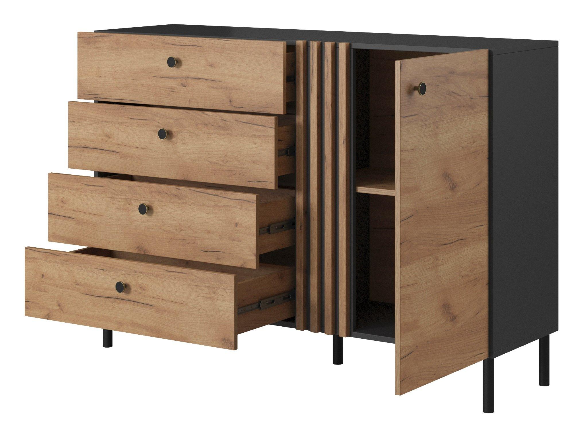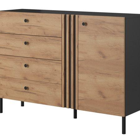 - Visokokakovostni materiali: izdelana iz MDF materiala, ki je znan po svoji trpežnosti in dolgi življenjski dobi. Barva korpusa v samostanskem hrastu in črni fronti doda pridih elegance in prestiža.