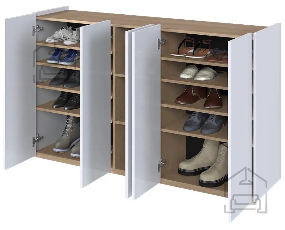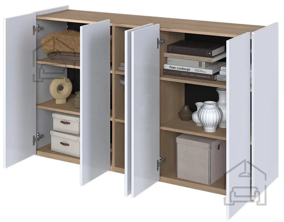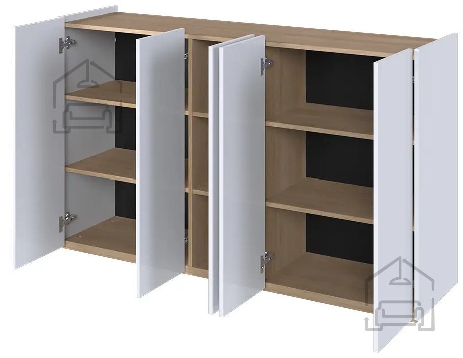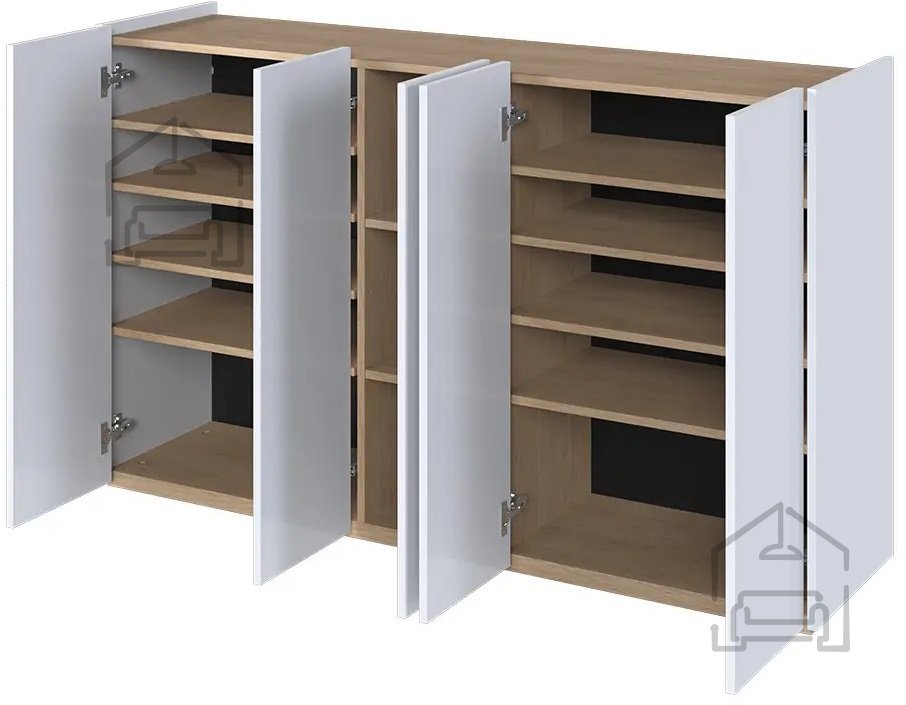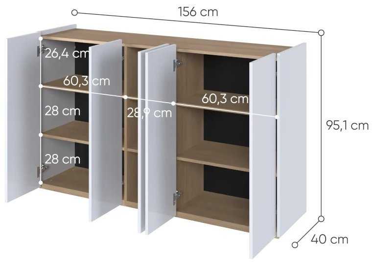 Barva: beli sijaj/skandi hrastDimenzije: 1560x950x400 mm Bel sijajni predalnik EA-01 je moden predlog, ki se bo odlično podal v dnevno sobo, spalnico, predsobo in otroško sobo.