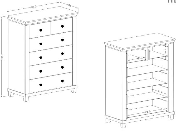 Komoda Evora S ni le lepa na pogled, ampak je tudi izjemno praktična. Opremljena je s šestimi predali, ki nudijo obilo prostora za shranjevanje vaših osebnih predmetov, oblačil ali drugih potrebščin. Predali so zasnovani tako, da jih je mogoče enostavno odpirati in zapirati, kar zagotavlja udobno uporabo vsak dan.