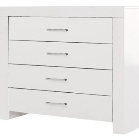 Komoda Figaro Bis v beli sijaj barvi je odlična izbira za tiste, ki želijo združiti eleganten dizajn s praktičnostjo. Sijajna površina doda prostoru svetlost, medtem ko štirje predali omogočajo učinkovito shranjevanje. Ne glede na to, ali jo postavite v spalnico, dnevno sobo ali katerikoli drug prostor, bo ta komoda prinesla tako vizualno privlačnost kot tudi funkcionalnost. | Material: Laminirana plošča