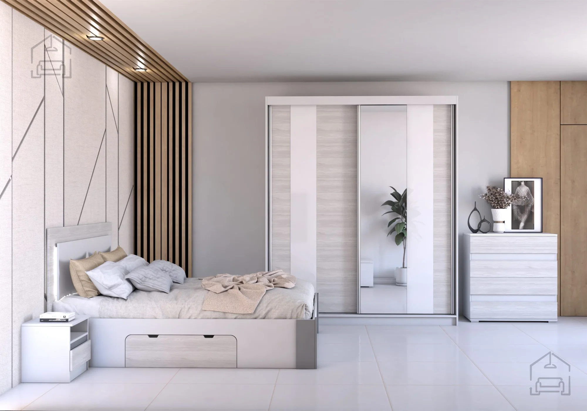 Moderen komplet pohištva za spalnico Helios je odlično pohištvo za sodobno spalnico, saj združuje praktičnost in estetski videz. Lepo kombinacijo barv, ki vključuje klasično belo in moderno sivo, dopolnjuje edinstvena kathult barva, kar naredi ta komplet prav poseben. Komoda se brez težav prilagodi različnim stilom notranje opreme, kar jo naredi izjemno vsestransko.
