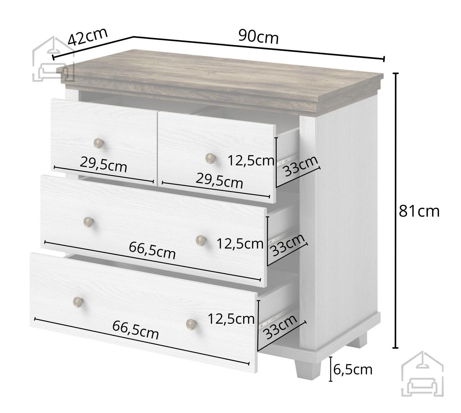 Komoda mala Evora S meri 90x42x81 cm, kar jo naredi idealno za različne prostore, ne glede na to, ali jo postavite v dnevno sobo, spalnico ali hodnik. Izdelana je iz visokokakovostne laminirane plošče, ki zagotavlja dolgo življenjsko dobo in odpornost. Laminirana plošča je znana po svoji trpežnosti in enostavnem vzdrževanju, kar pomeni, da bo vaša komoda videti kot nova še vrsto let.