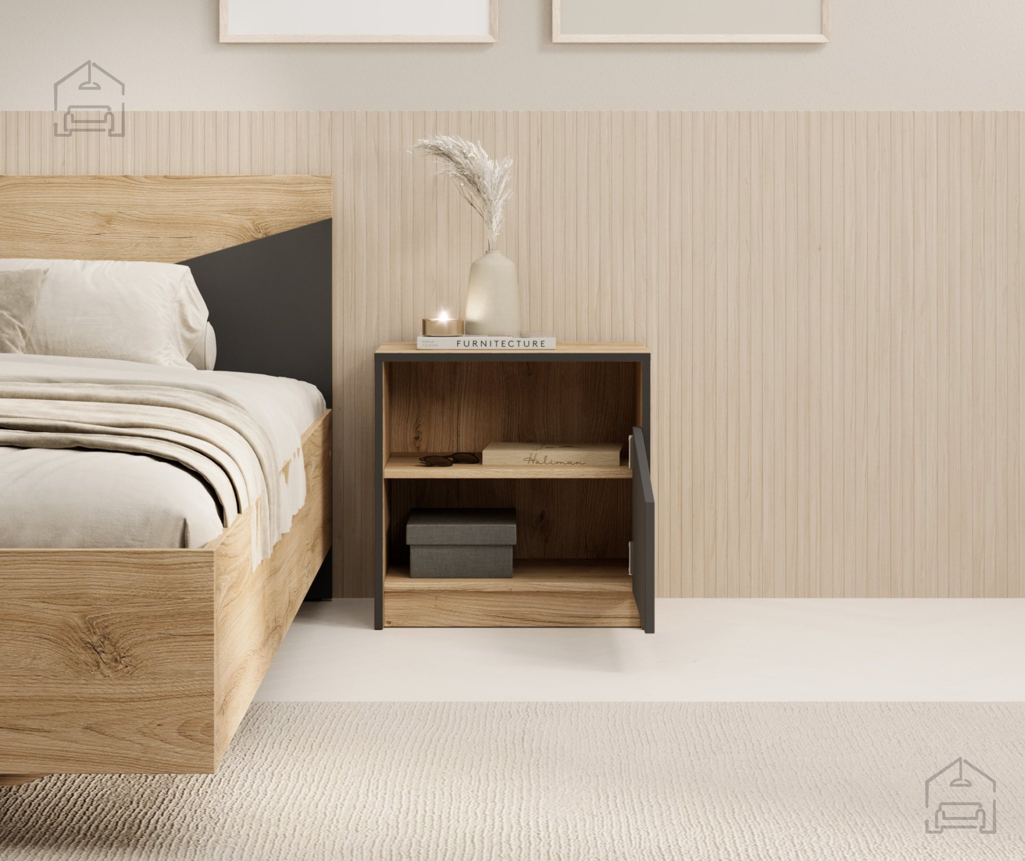 Z dimenzijami 46.3x41x55 cm je nočna omarica Galaxy dovolj prostorna, da zadovolji vse vaše potrebe po shranjevanju, hkrati pa dovolj kompaktna, da se prilega tudi manjšim prostorom. Njena barva korpusa v samostanskem hrastu se odlično ujema z elegantnim črnim frontom, kar ji daje brezčasno privlačnost in prefinjenost.