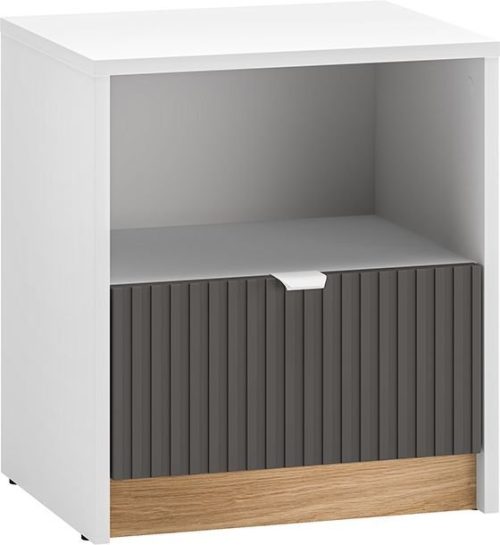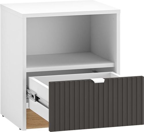 Nočna omarica Torino 09 se ponaša z elegantnim in sodobnim dizajnom, ki bo v vašo spalnico vnesel pridih sodobne elegance. Fronta v beli barvi z MDF grafit mat detajli ponuja subtilen kontrast, ki je hkrati osupljiv in skladen. Korpus v beli barvi v kombinaciji s hrastom Castello dodaja pridih naravne topline, ki se odlično ujema z različnimi dekorativnimi slogi.