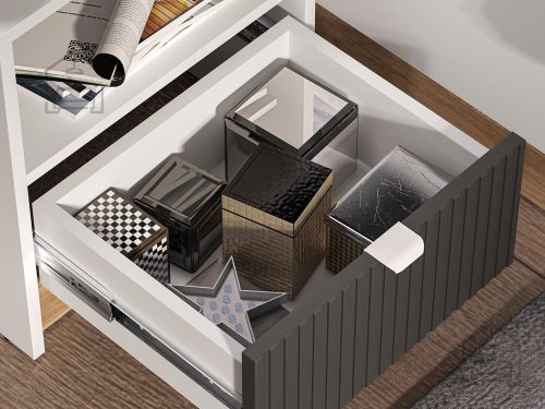 Ena izmed ključnih prednosti nočne omarice Torino 09 je mehko zapiranje predalov. Ta funkcionalnost ne le povečuje uporabniško izkušnjo, temveč tudi podaljšuje življenjsko dobo omarice, saj zmanjšuje obrabo zaradi vsakodnevne uporabe. Predali so zasnovani tako, da omogočajo tiho in gladko zapiranje, kar prispeva k mirnemu in sproščujočemu okolju v vaši spalnici.